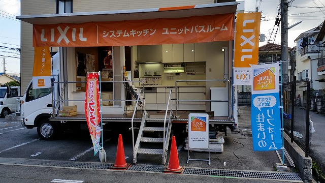 1、LIXILのシステムキッチン、ユニットバス、洗面化粧台を搭載したトラックが当店にやってきます^^